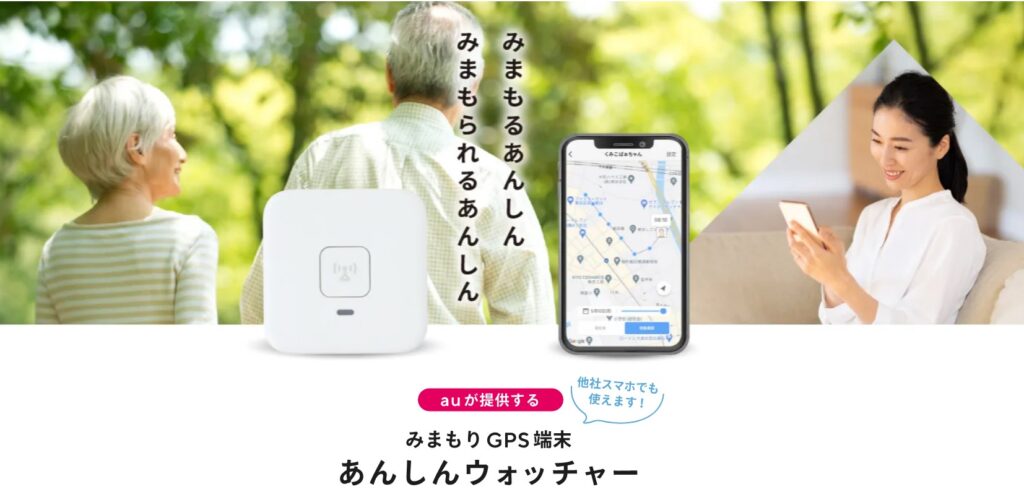 あんしんウォッチャーLEは、KDDI 提供の見守りGPS端末で、子ども用だけでなく高齢者見守り用途にも対応しています。手のひらに収まるサイズで持ちやすく、簡単ボタン操作で保護者に位置情報を通知できる設計です。